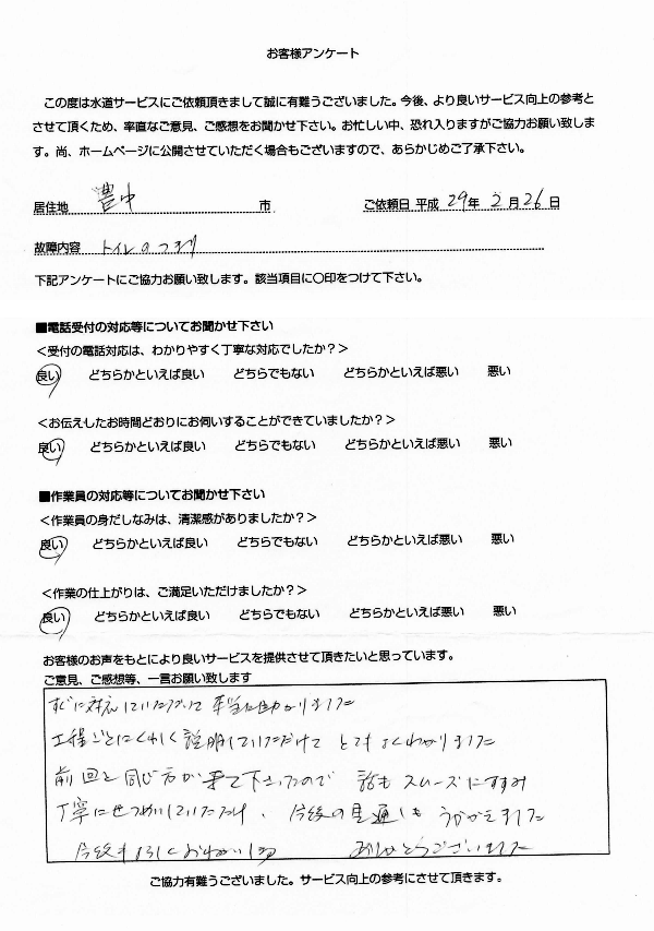 - コメント:すぐに対応していただいて本当に助かりました。工程ごとにくわしく説明していただけてとても分かりました。前回と同じ方が来て下さったので話もスムーズにすすみ丁寧にせつめいしていただけ、今後の見通しもうかがえました。今後もよろしくおねがいします。ありがとうございました。