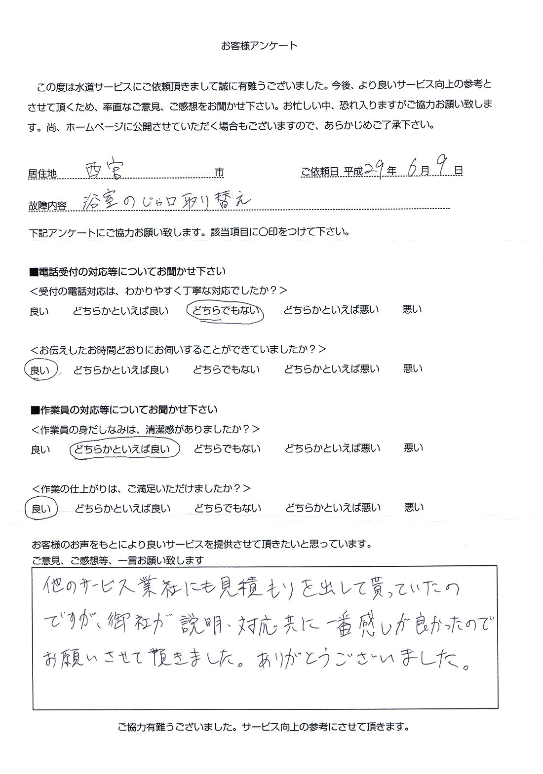 - コメント:他のサービス業者にも見積もりを出して貰っていたのですが、御社が説明・対応共に一番感じが良かったのでお願いさせて頂きました。ありがとうございました。