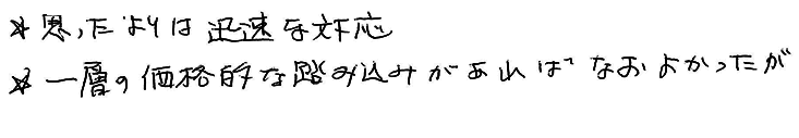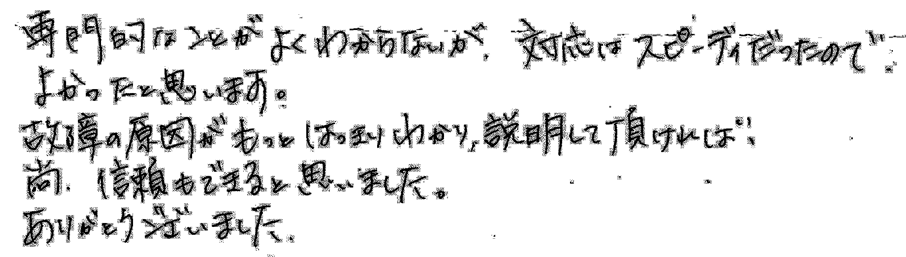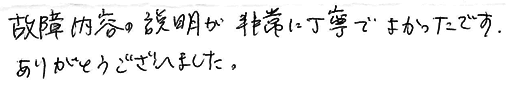 故障内容の説明が非常に丁寧でよかったです。ありがとうございました。