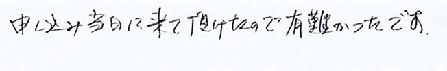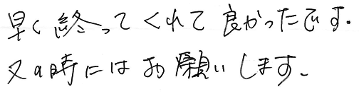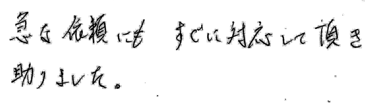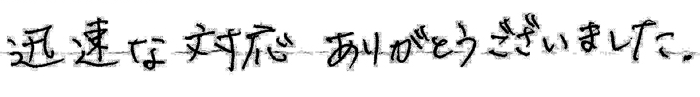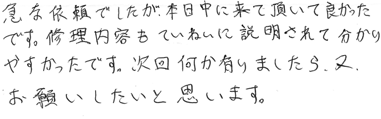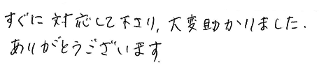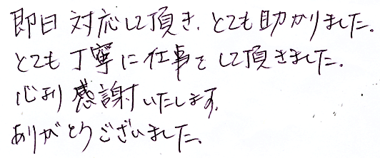 即日対応していただき、とても助かりました。とても丁寧に仕事をして頂きました。心より感謝いたします。ありがとうございました。