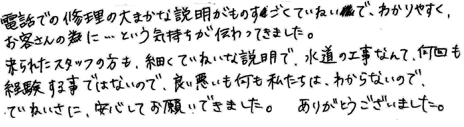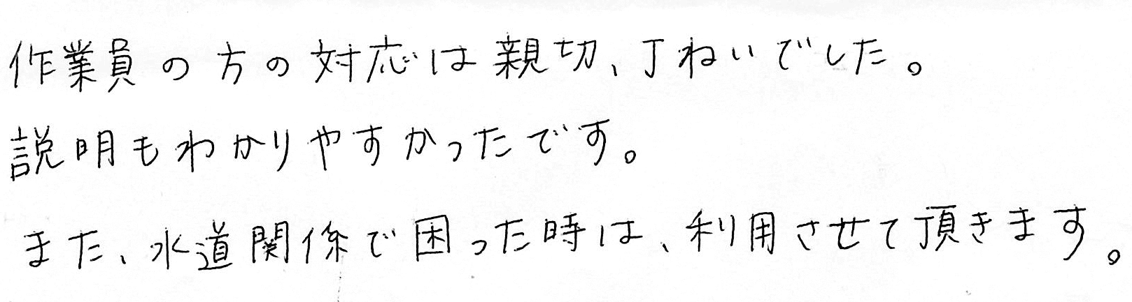 作業員の方の対応は親切丁寧でした。説明もわかりやすかったです。また水道関係で困った時は利用させて頂きます。