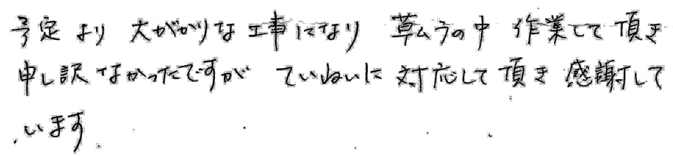 予定より大掛かりな工事になり草むらの中作業して頂き申し訳なかったですが、丁寧に対応して頂き感謝しています。
