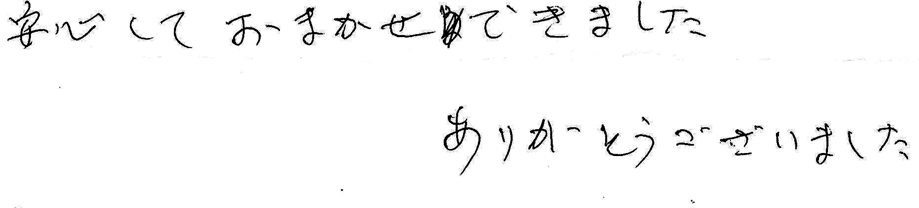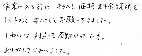 作業に入る前にきちんと価格料金説明をして下さって安心してお願いできました。丁寧な対応も有難かったです。ありがとうございました。