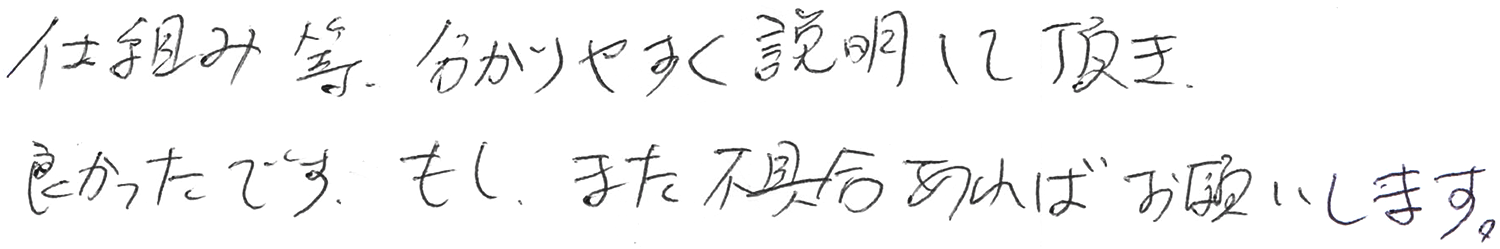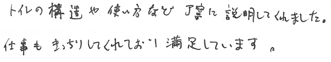 トイレの構造や使い方など丁寧に説明してくれました。仕事もきっちりしてくれており満足しています。