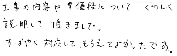 工事の内容や値段についてくわしく説明して頂きました。すばやく対応してもらえてよかったです。