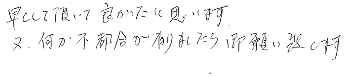 早くして頂いてよかったと思います。又、何か不都合が有りましたら御願い致します。