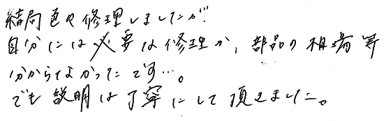 修理の説明や金額の見積りなどもとても詳しくわかりやすくお話していただいたので、作業内容もよく理解することが出来納得しました。親切な対応でした。