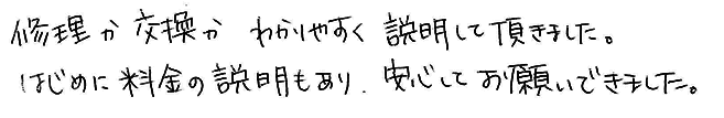 丁寧な説明で、安心できました。故障個所だけでなく他の不具合もなおしてもらえ有難かったです。