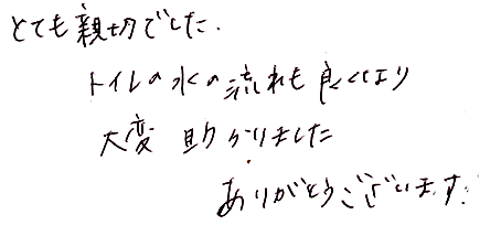とても親切でした。トイレの水の流れも良くなり大変助かりました。有難うございます。