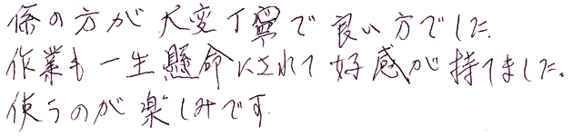 係りの方が大変丁寧で良い方でした。作業も一生懸命にされて好感が持てました。使うのが楽しみです。