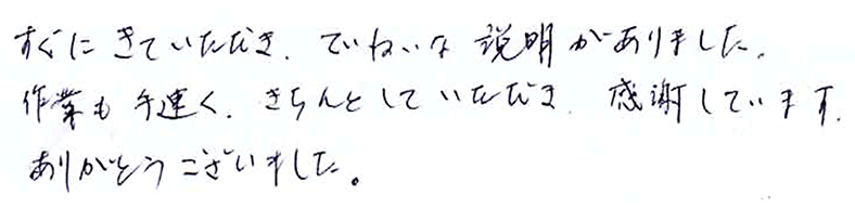 すぐに対応、修理して頂き助かりました。作業の説明もわかりやすく、丁寧で気持ち良かったです。